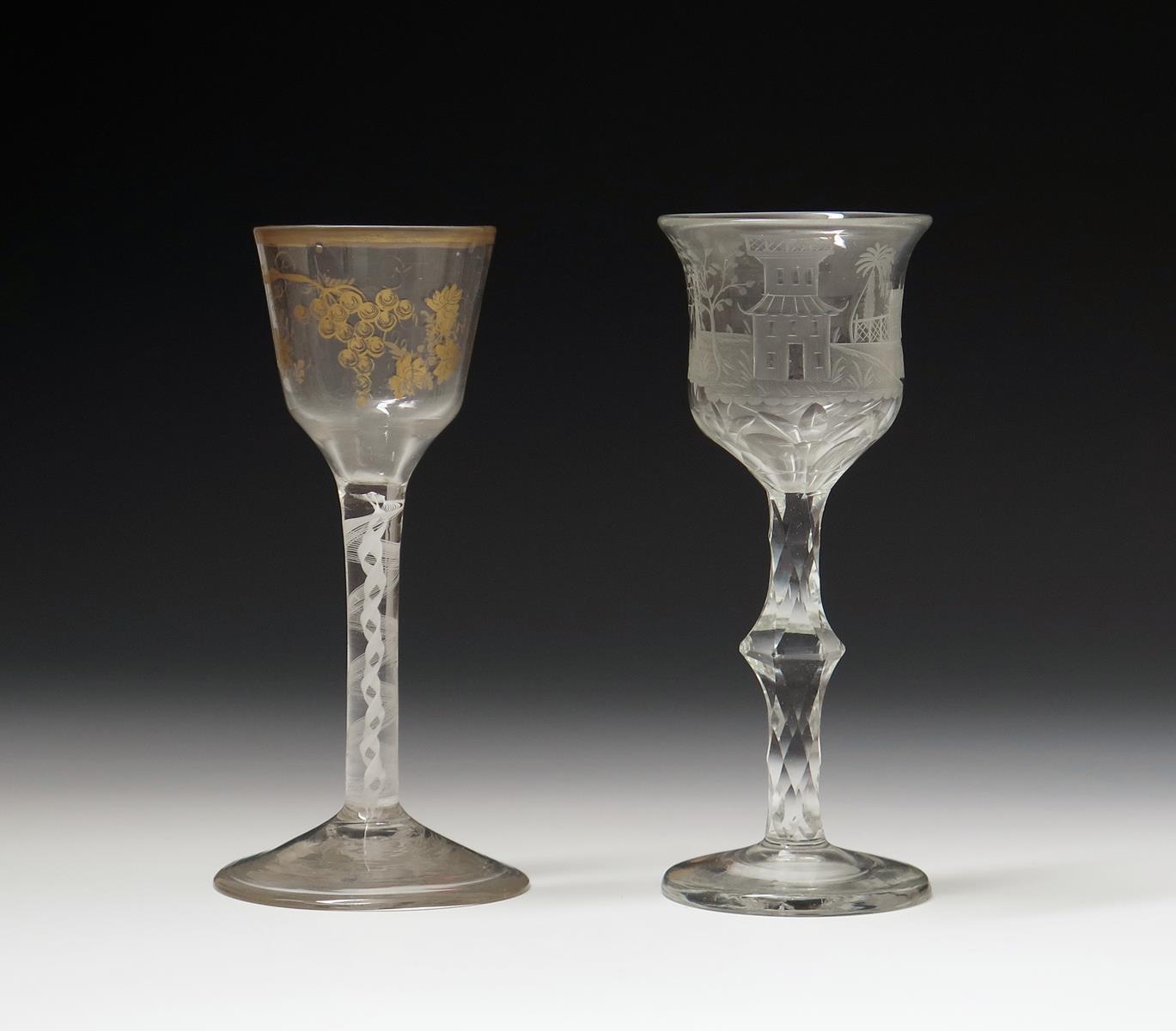 Two wine glasses c.1780, one decorated in the atelier of James Giles with gilt grapevine above a double series opaque twist stem, the other with ogee bowl and engraved with a chinoiserie landscape above a knopped faceted stem, 15.3cm max. (2)