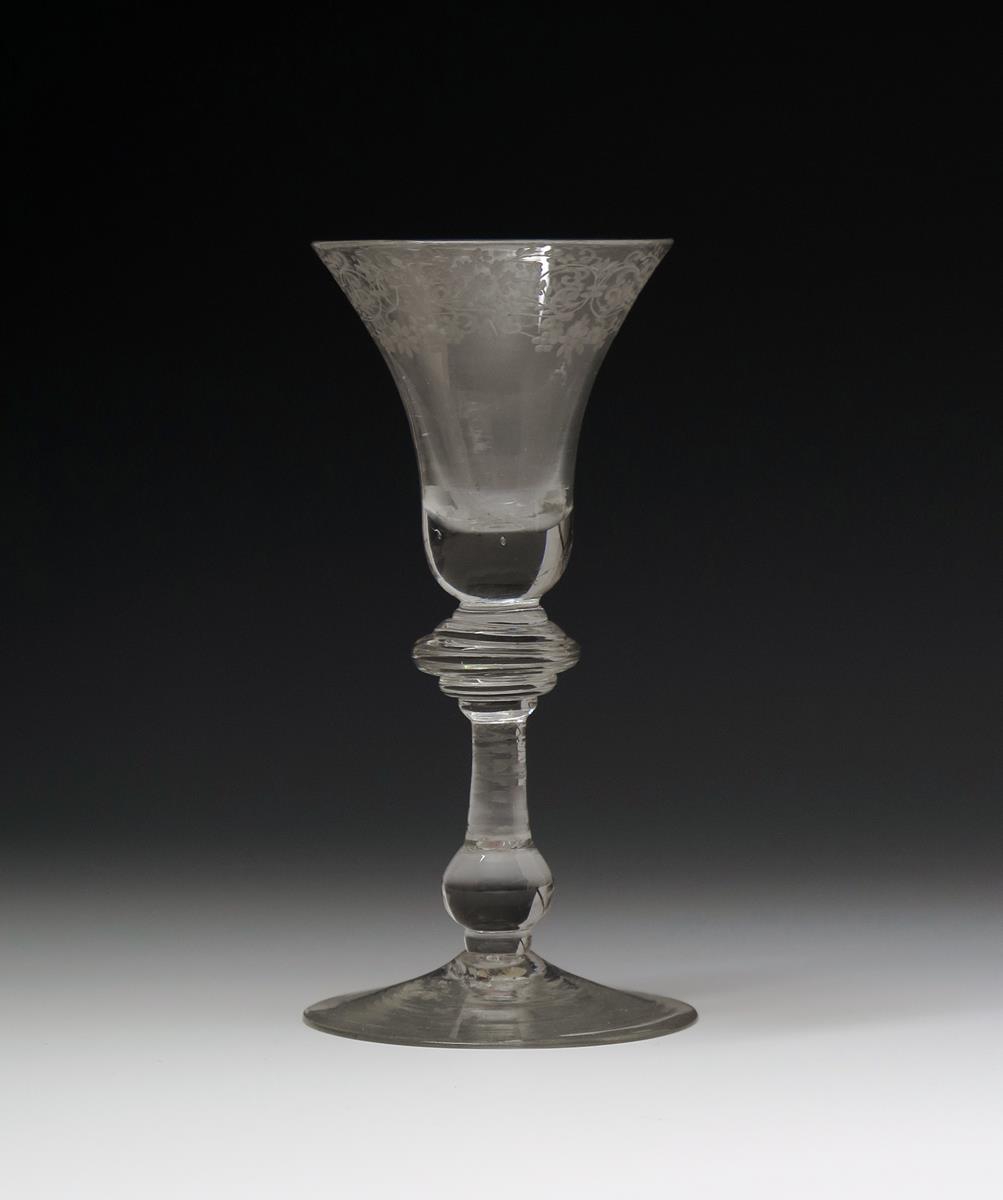 A large light baluster glass mid 18th century, the bell bowl engraved with a formal floral border to the rim, with a graduated ring knop at the base of the bowl, 16.7cm.