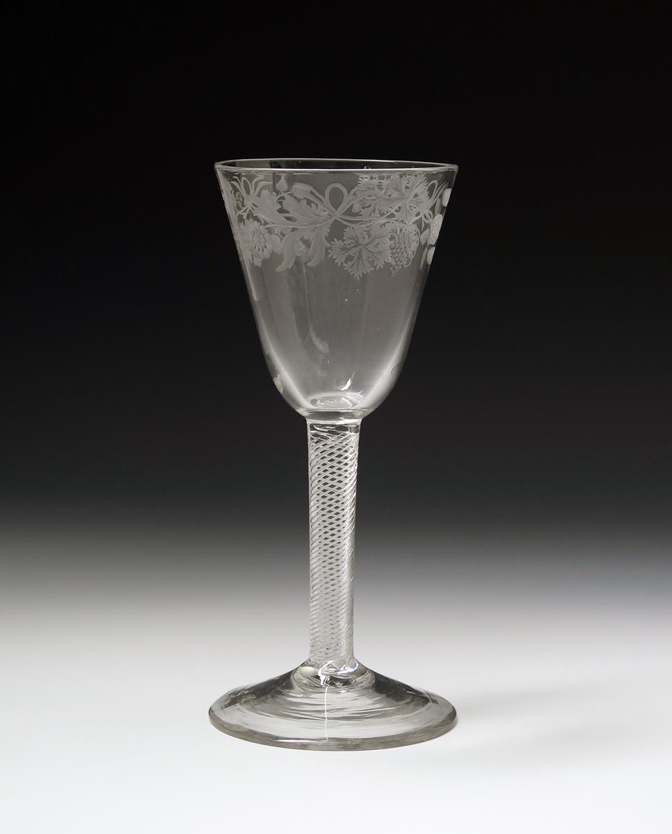 A large goblet c.1760, the rounded funnel bowl engraved with three sprays of grapevine and flowers, raised on a dense airtwist stem above a conical foot, 21.5cm.