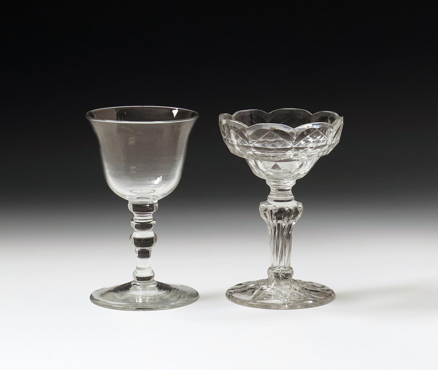 Two sweetmeat glasses c.1770-80, one with a facet cut bowl and scalloped rim, raised on a pedestal stem, the other with a plain bowl above a baluster knopped stem, 16cm. (2)