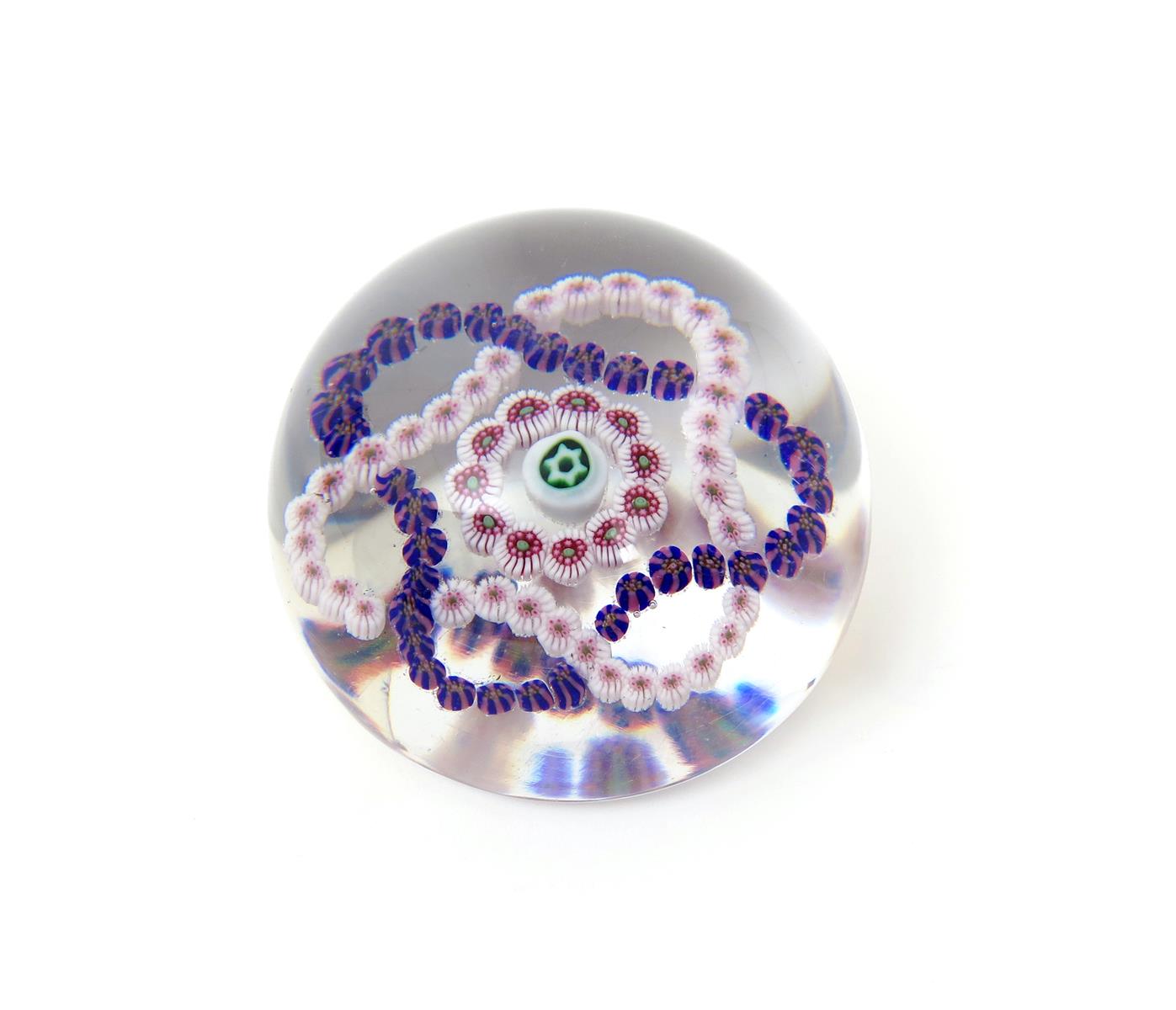 A French glass paperweight c.1860, enclosing a garlanded design of two overlapping strings of canes around a small ring and star cane, 7cm.