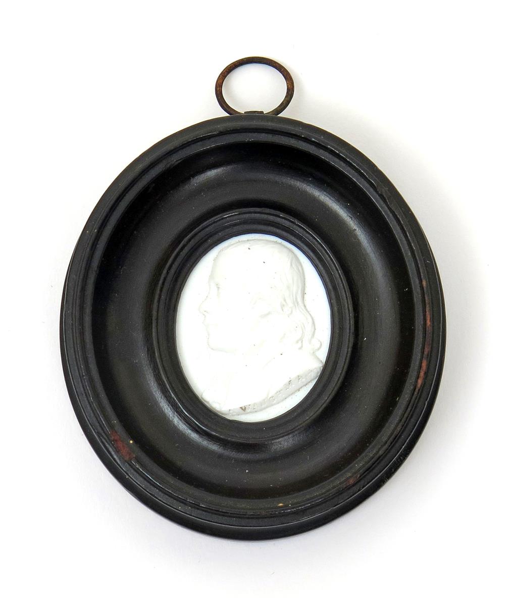 A small portrait plaque of Alexander Waugh, facing left and mounted in a black wood frame, inscribed 'A Waugh MA 1791', 7cm overall.