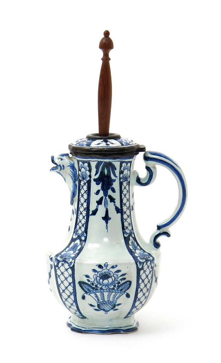 A French faïence chocolate pot late 18th century, the lobed form painted in blue with baskets of flowers between narrow diaper panels and formal foliate motifs, the spout formed as the head of a mythical beast, the hinged cover with a circular aperture to receive a later wooden swizzler, blue R mark to the base, the pot 19.2cm. (2)
