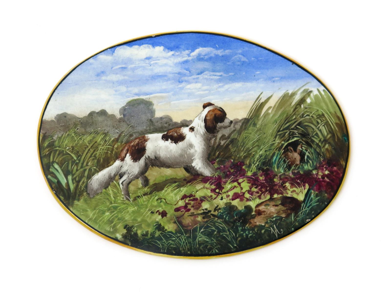 An Italian maiolica oval plaque 19th century, painted with a brown and white spaniel about to root out a rabbit from its hiding place among a patch of tall grass, edged in yellow, 15.5cm.