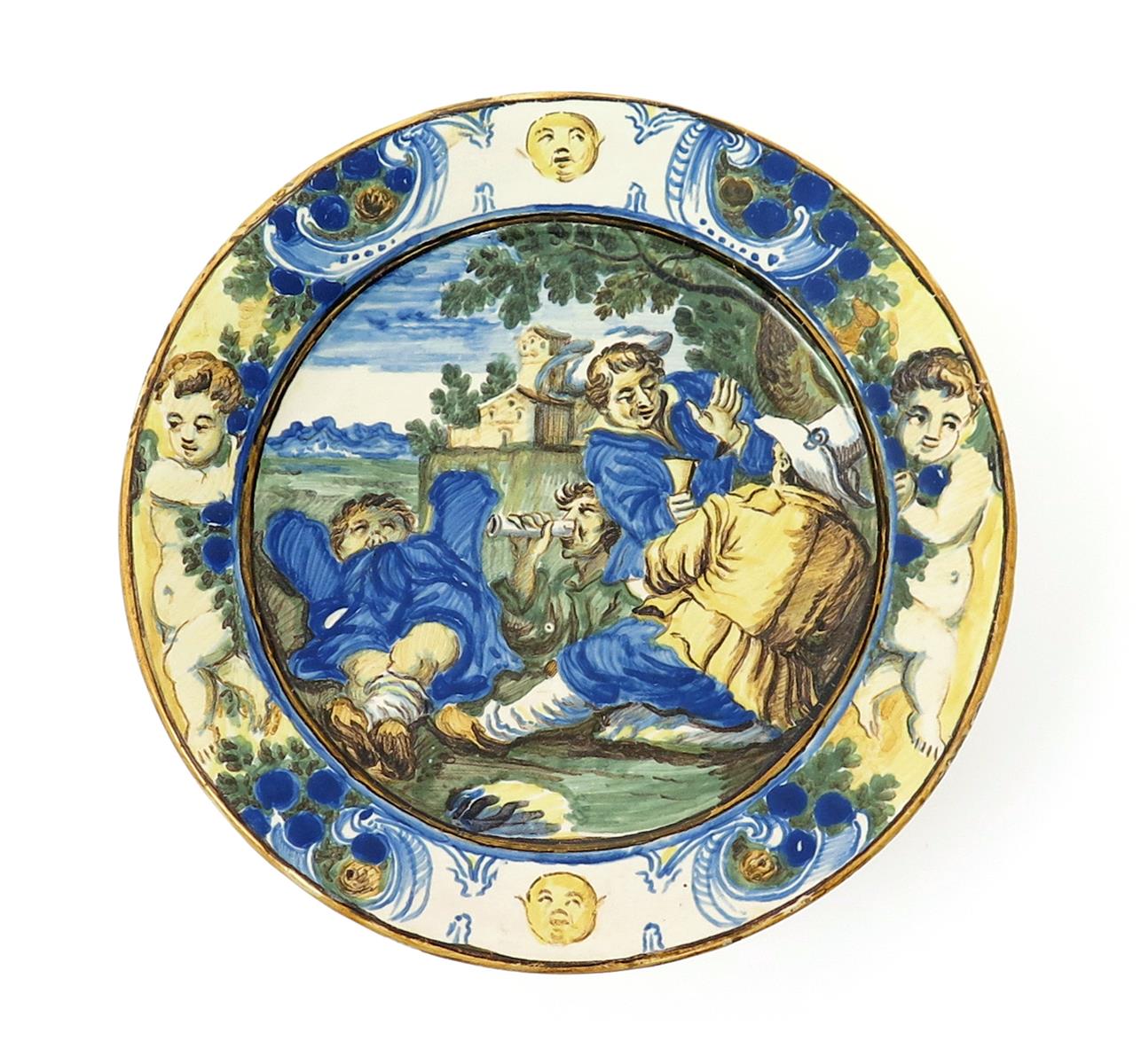 A small Castelli maiolica plate early 18th century, painted with four men at repose beneath a tree, drinking, talking and reclining, with buildings and mountains visible in the distance, the rim with two putti and two masks between scrolls and foliage, 17.5cm.