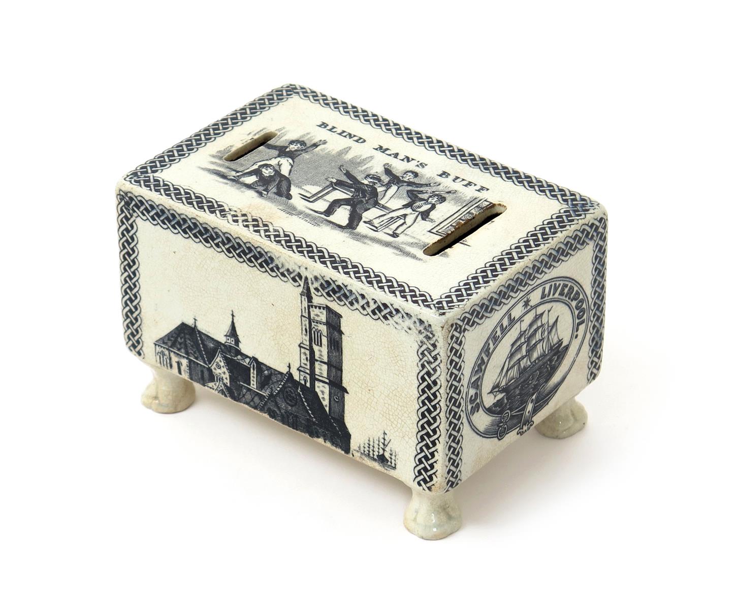 A pearlware rectangular moneybox 2nd half 19th century, the top printed in black with boys playing Blind Man's Buff, the long sides with a view of a church, the shorter with tea clippers titled 'Scawfell Liverpool' and 'Warrior Stockton', raised on four paw feet, the top pierced with two differently sized apertures, 12.5cm across.