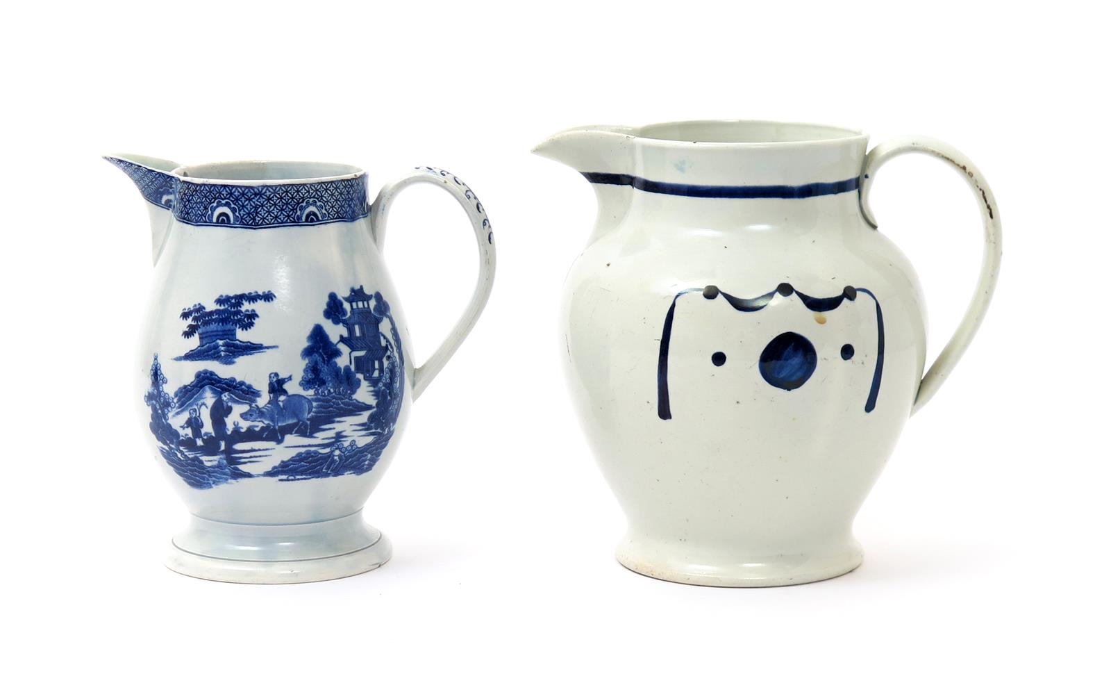 Two pearlware jugs early 19th century, one printed in blue with a boy riding a buffalo in a Chinese pagoda landscape, the other painted to one side with a simple gilliflower spray, the reverse with with an unusual design of swags over dots, 18.3cm max. (2)