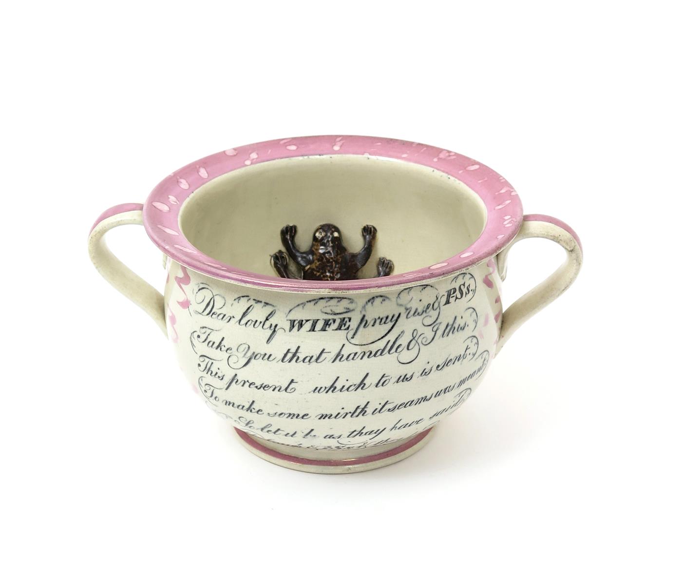 A Sunderland lustre novelty 'Marriage Gift' chamber pot 19th century, the exterior printed with verses including 'This Pot it is a present sent, Some mirth to make is only meant', the interior applied with a frog clambering up the inside wall, the handles and rim with bands of pink lustre, 8.5cm dia.
