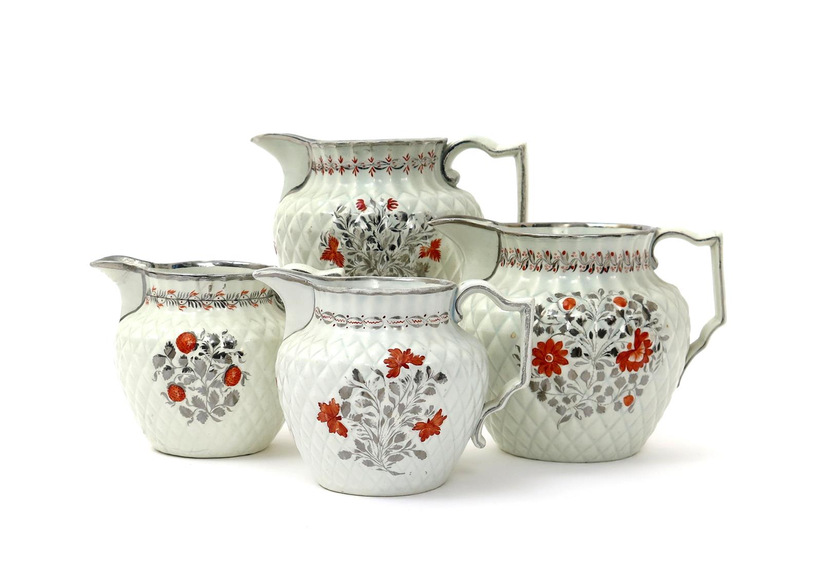Four pearlware pineapple-moulded jugs 1st half 19th century, painted in red and silver lustre with stylized flower sprays and formal borders, one impressed 'Harley', some damages, 13.5cm max. (4)