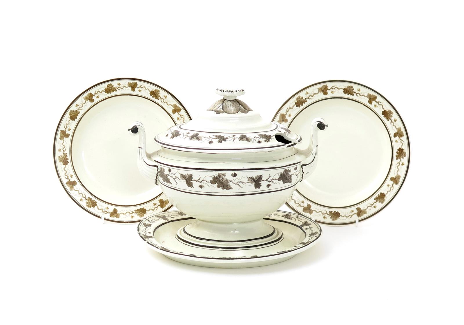 A Wedgwood creamware sauce tureen and two plates early 19th century, painted in sepia with continuous bands of grapevine, the tureen with a built-in stand, impressed marks to the plates, 24cm max. (4)