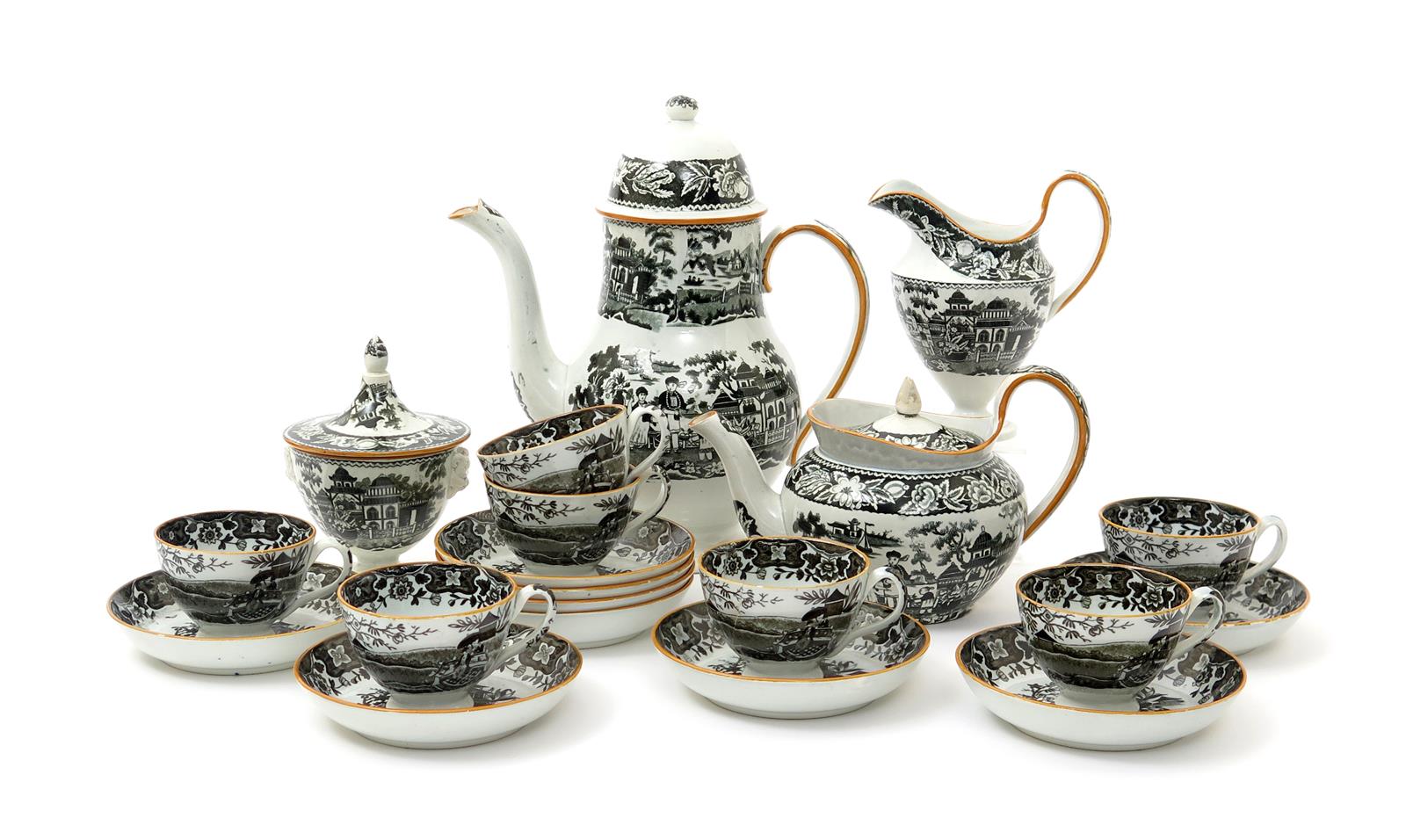 A pearlware part tea and coffee service 19th century, printed in black with figures in an Eastern landscape scene, beneath wide floral borders with ochre line rims, some damages. Comprising: a coffee pot and cover, a teapot and cover, a sucrier and cover, a milk jug, seven teacups and nine saucers. (23)