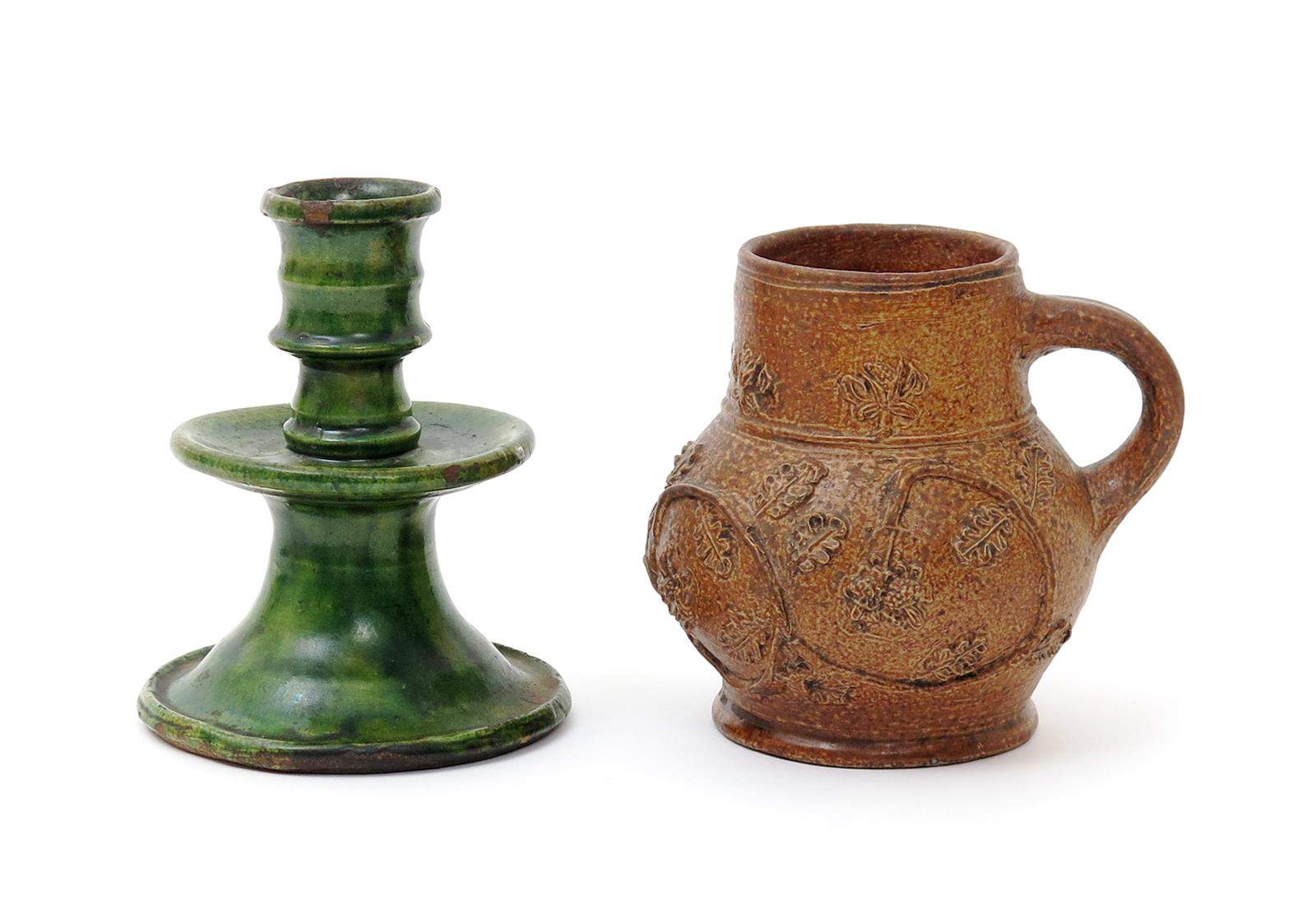A German salt-glazed stoneware mug 16th century, the thistle-shaped body applied with trailing oak branches, and an early Dutch pottery candlestick, with a flared foot and wide drip pan, glazed in green, minor faults, 12.6cm max. (2)