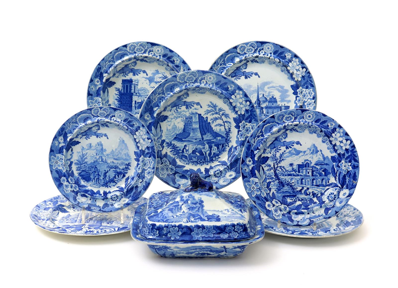 A blue and white transferware tureen and cover and seven dishes 1st half 19th century, probably Don Pottery including the Named Italian Views series, variously printed with figures and buildings in landscapes within wide floral bands, including 'Near Taormina' and 'Obelisk of Catania', 25cm max. (9)