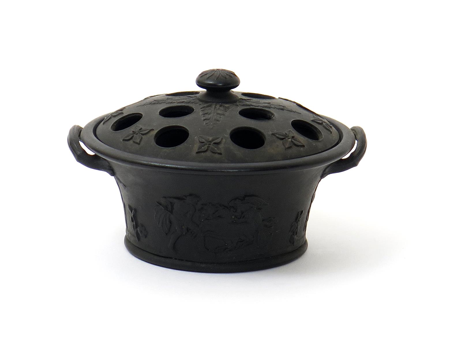 A Wedgwood black basalt violeteer or small pot pourri basket and cover c.1800, the side decorated with a Classical god stopping a winged figure in a horse-drawn carriage, and with another figure washing the feet of a maiden, the cover pierced with an arrangement of circular holes, impressed mark, 11.2cm dia. (2)