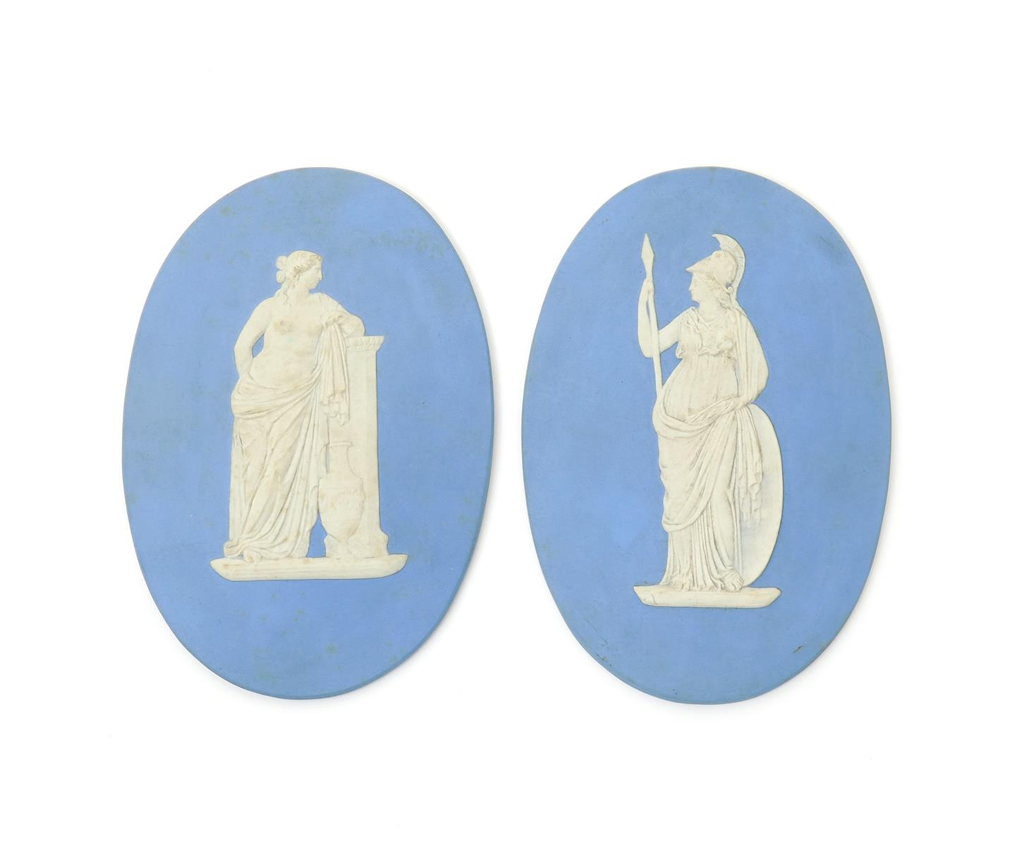 A large pair of Wedgwood Jasperware oval plaques 19th/early 20th century, one applied with a Classical maiden leaning on a tall pillar beside a vase, the other with a Classical warrior maiden holding a spear, in white reserved on a blue ground, impressed marks, 21cm. (2)