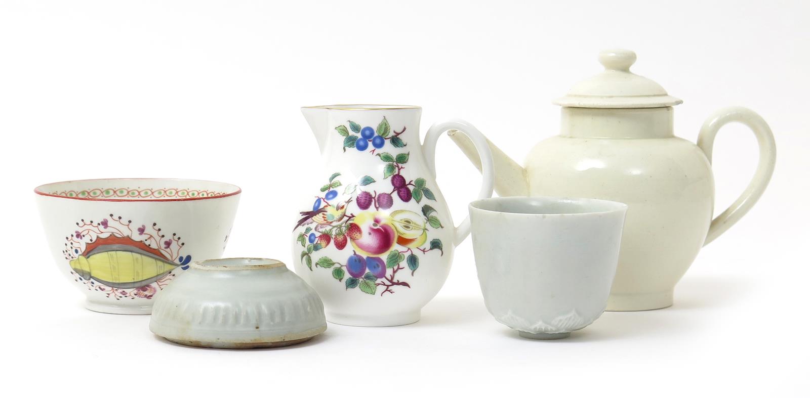 A small mixed group of ceramics, including a small creamware teapot and cover, an early Chinese box base in a celadon glaze, a Chinese teabowl or wine cup moulded with leaf bands, a large English porcelain teabowl painted with simple shells, and a modern Royal Worcester milk jug printed with a bird perched on fruit, some faults, 14.5cm max. (6)