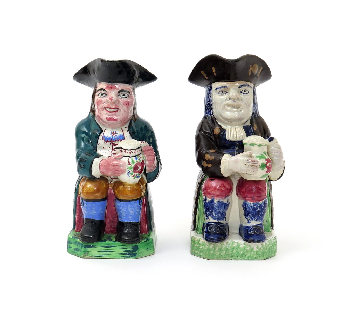 Two pearlware Toby jugs c.1810-20, decorated in Portobello type colours, each resting a foaming jug of ale on their knee, one handle broken off and restored, 24.5cm. (2)