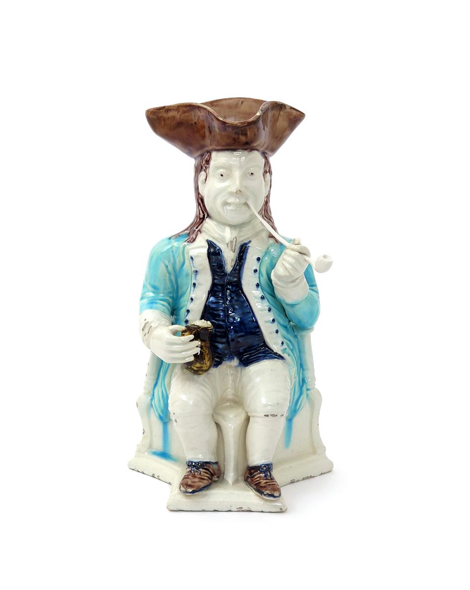 An unusual Squire Toby jug c.1810-20, seated on a shaped base and wearing a bright turquoise jacket over a blue waistcoat, holding a small jug of ale and a long-stemmed pipe, a little chipping, his pipe a replacement, 29.5cm.