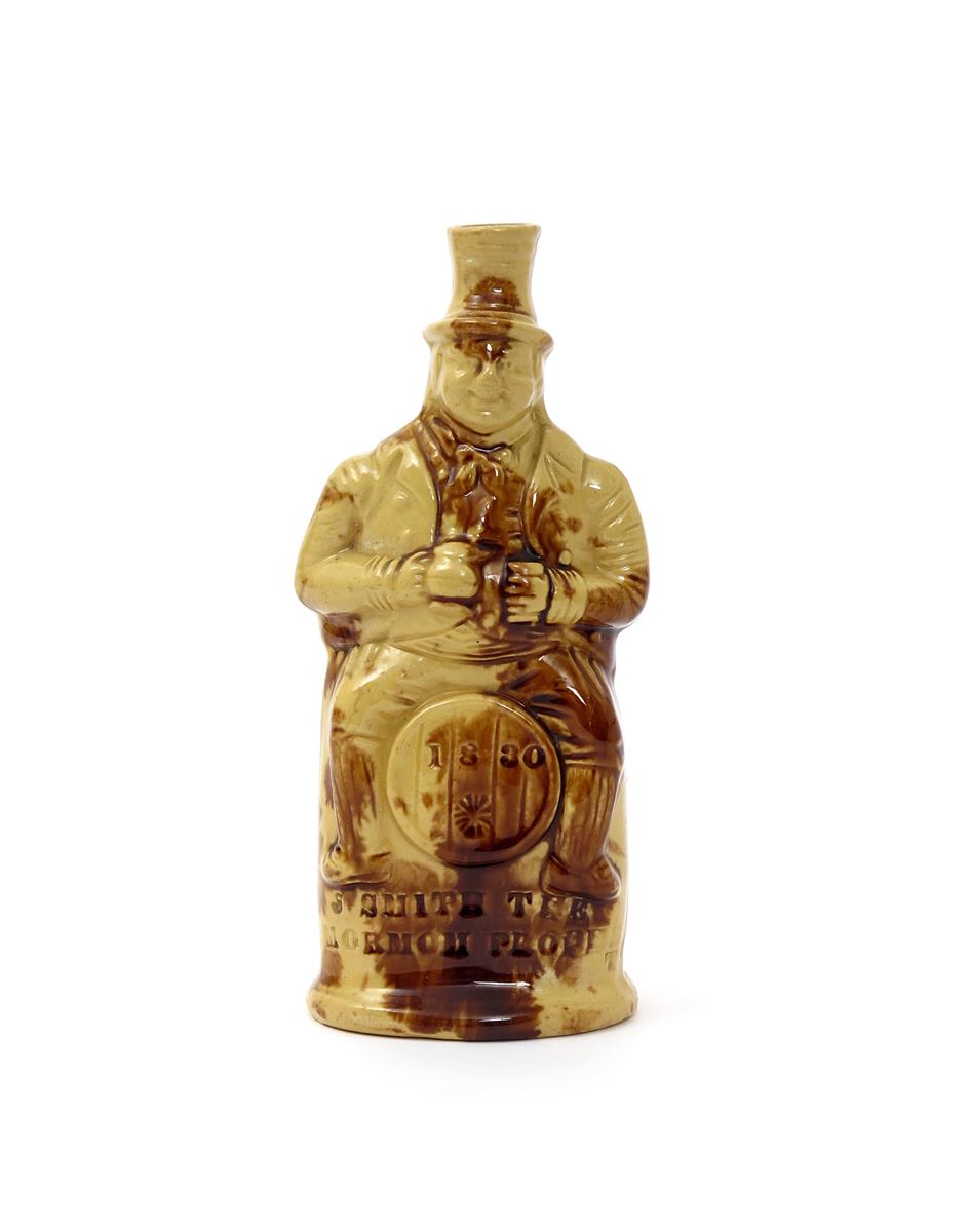 A Rockingham pottery figural spirit flask dated 1830, modelled as a man in a top hat, seated astride a barrel and holding a jug and glass, impressed 'J Smith The Mormon Prophet', decorated in a running treacle glaze, 22.5cm.