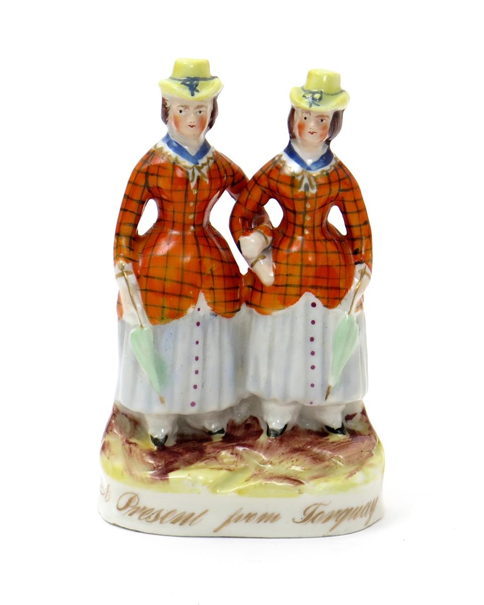 A Staffordshire figure group of the Alphington Ponies c.1845, the two sisters modelled standing with arms linked, wearing their characteristic checked jackets and holding green parasols, the base titled in gilt 'A Present from Torquay', 12cm.