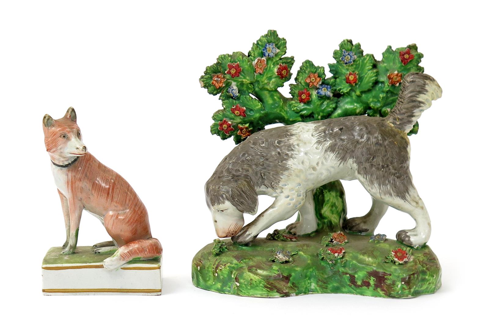 Two pearlware figures of animals early 19th century, one of a fox, wearing a collar and seated with its head turned to sinister, raised on a rectangular base, the other of a long-haired dog, sniffing a flower on a grassy base before flowering bocage, the dog's tail broken and restuck, 14.6cm max. (2)