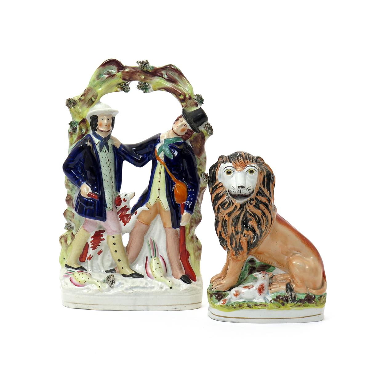 Two Staffordshire flatback figures 19th century, one depicting the murder of Thomas Smith by William Collier, the other of a lion seated on its haunches with a lamb recumbent at its side, 34cm max. (2)