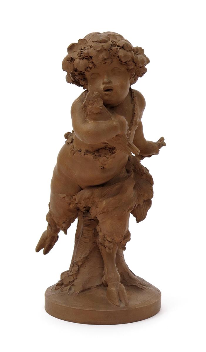A French terracotta model of a running satyr c.1770, after Claude Michel known as Clodion (1738-1814), the youngster clutching an owl to his chest, wearing a crown of leaves, raised on a circular base, 27cm.