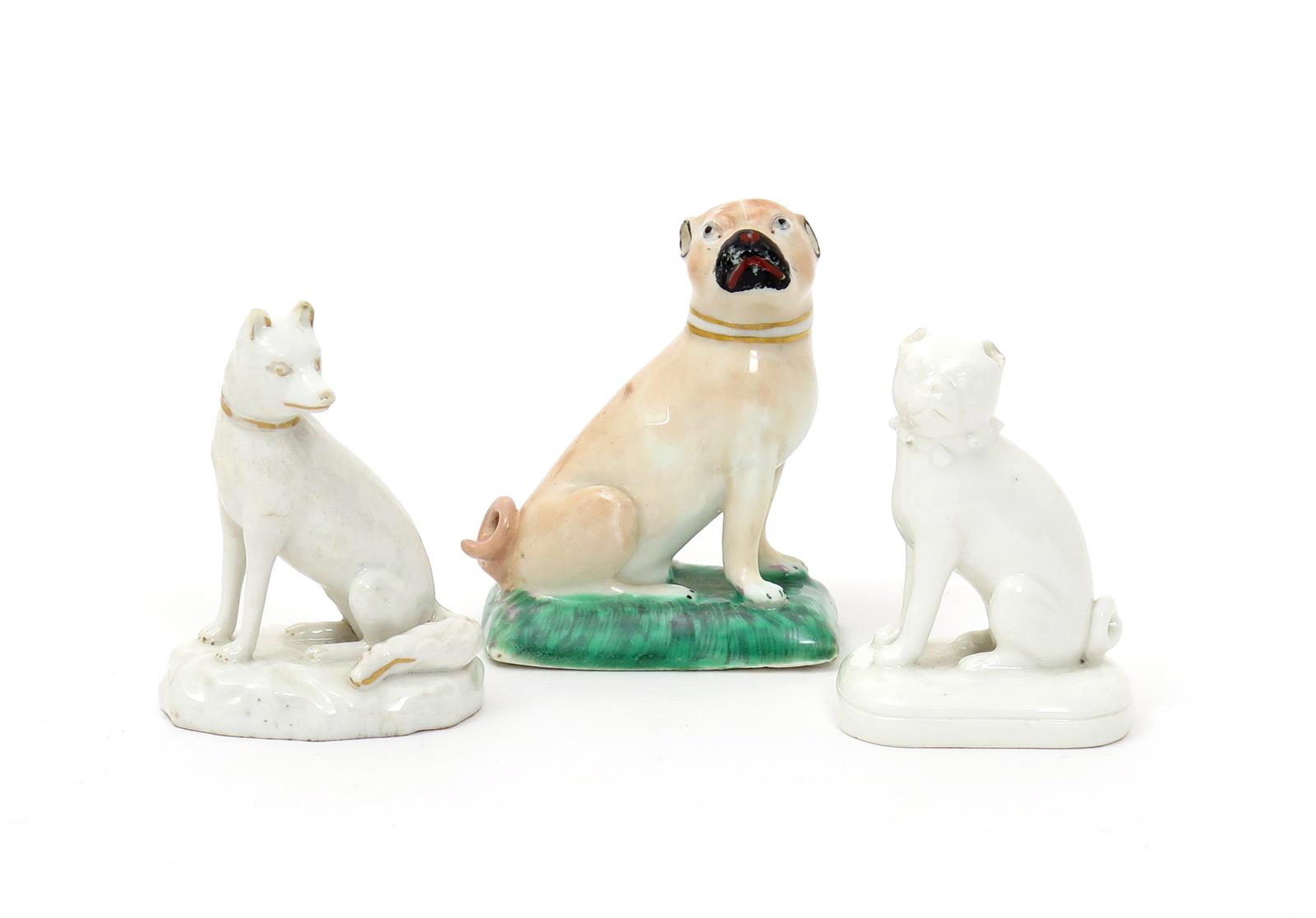 Three Derby models of animals late 18th century, two of pug dogs, seated on their haunches with heads turned, one decorated in coloured enamels and with an incised star mark for the repairer Isaac Farnsworth, the last of a fox, seated and with head turned to sinister, wearing a gilded collar, minor faults, 8cm max. (3)