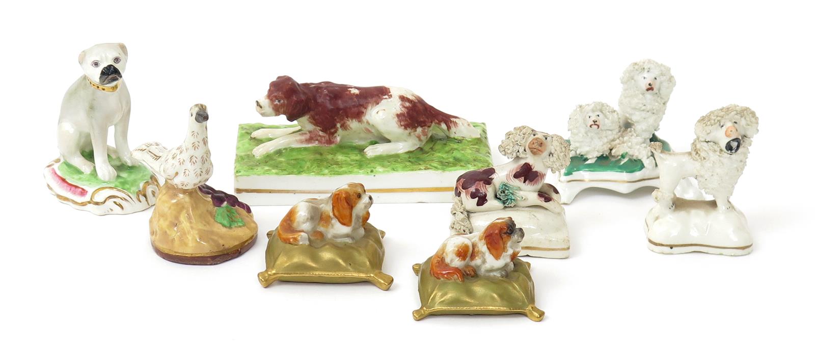 Seven small English porcelain figures of dogs most 1st half 19th century, three of poodles, one of a seated pug, one of a setter, recumbent on a rectangular base, and two Royal Worcester figures of Cavalier spaniels on tasselled cushions, together with a Staffordshire porcelain model of a bird beside a bunch of grapes, minor faults, 10.7cm max. (8)
