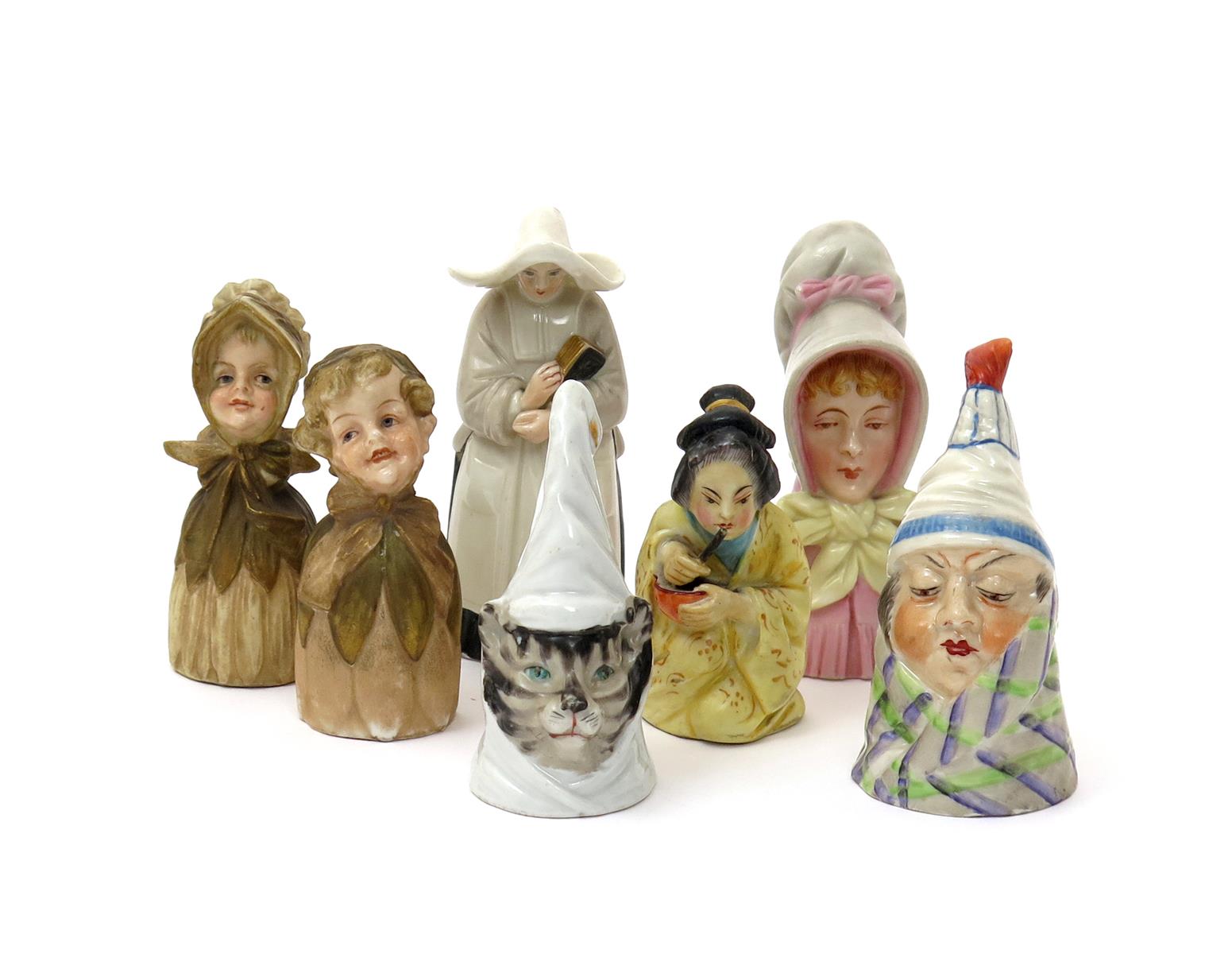 Four Royal Worcester candle snuffers late 19th and early 20th century, including Mr Caudle, the Young Girl, a nun and a kneeling Japanese girl, and three other English porcelain snuffers including a pair of children and a cat in a pointed night cap, 9cm max. (7)