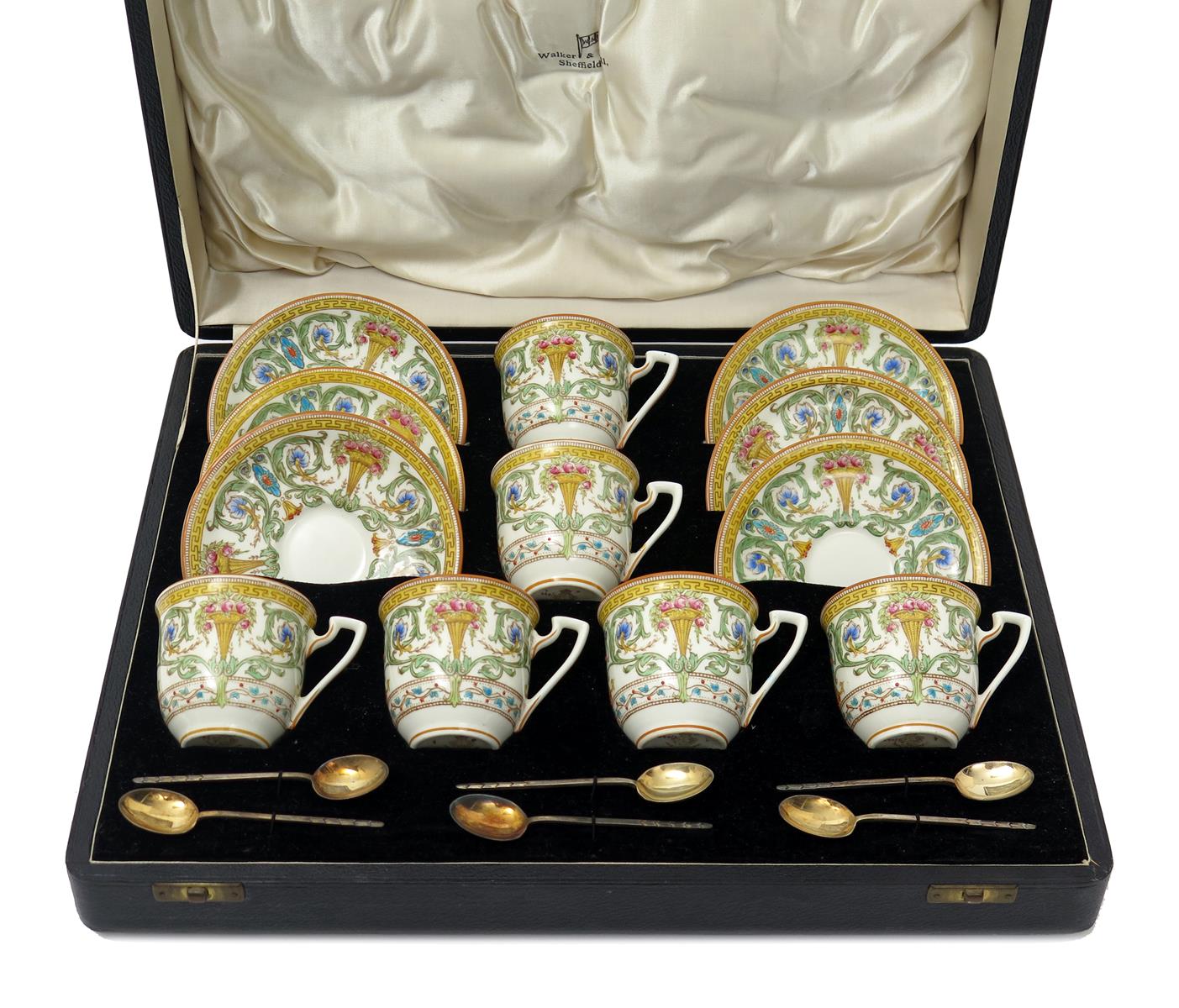 A cased Royal Worcester coffee set date code for 1938, printed and hand-coloured with vases of roses amid foliate scrolls, the cups with angular handles. Comprising: six coffee cups, six saucers and six silver spoons, enclosed in a lined case for Walker & Hall of Sheffield.