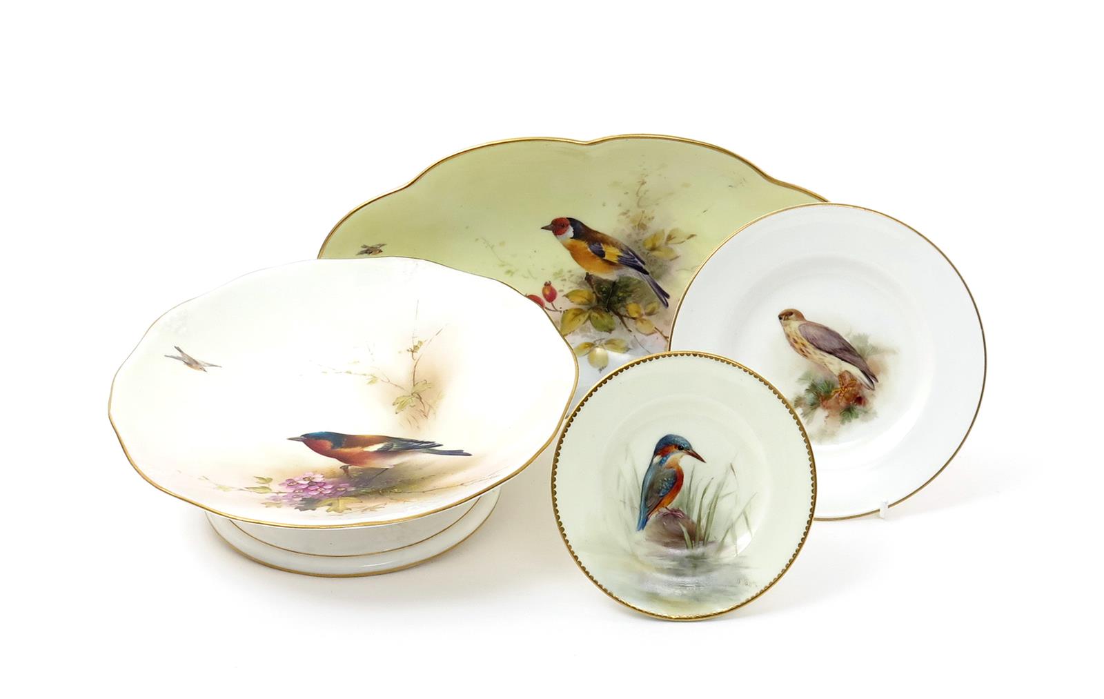 A Royal Worcester tazza and three plates date codes for 1910, 1912, 1917 and 1932, variously painted with birds including a goldfinch, chaffinch, merlin and kingfisher, two signed 'E Barker', one 'W Powell', printed marks, 28.3cm max. (4)