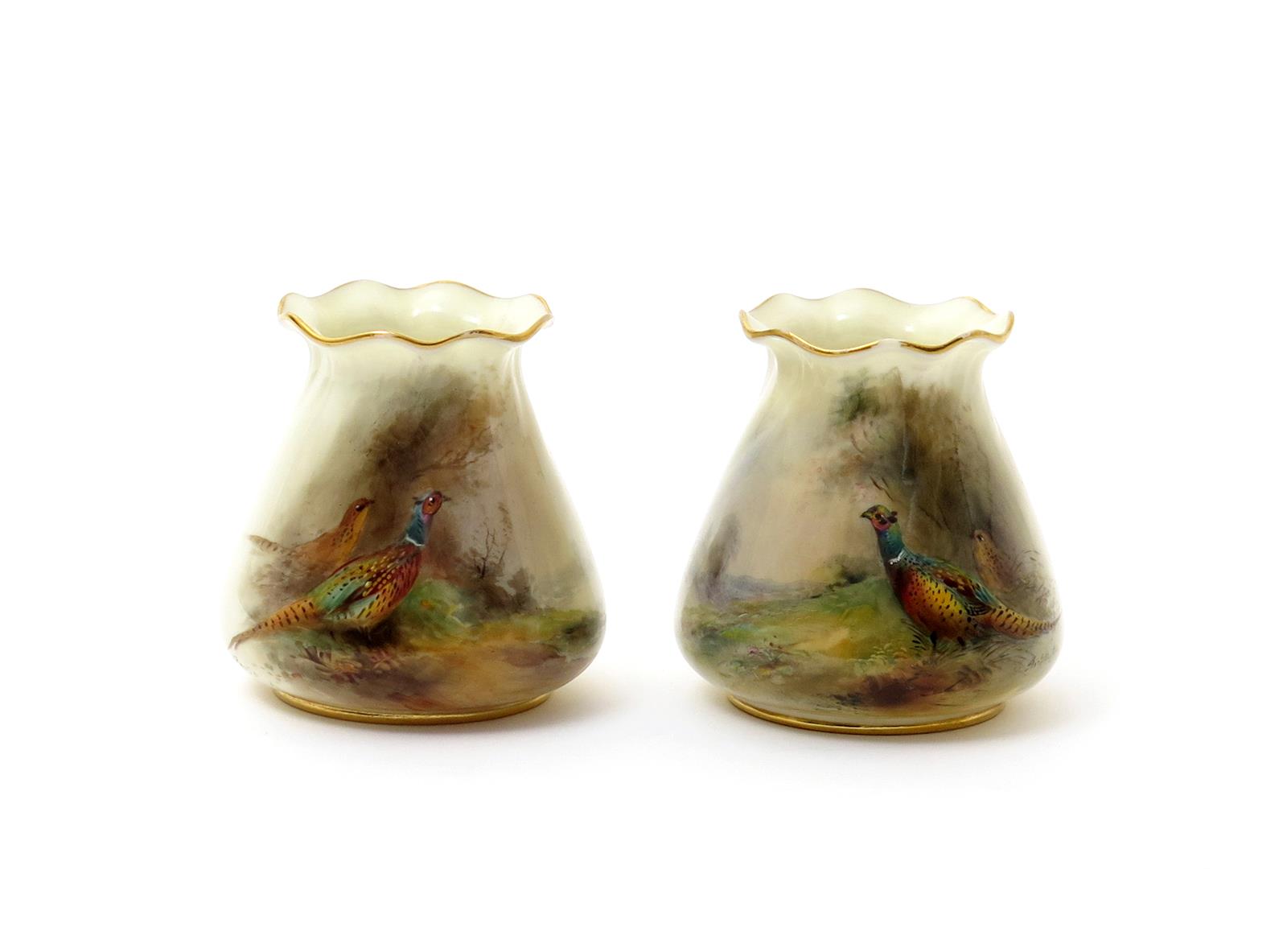 A small pair of Royal Worcester vases date codes for 1919, the sack forms painted by James Stinton each with a pair of pheasants in a wooded landscape, signed, printed marks, 8.3cm. (2)