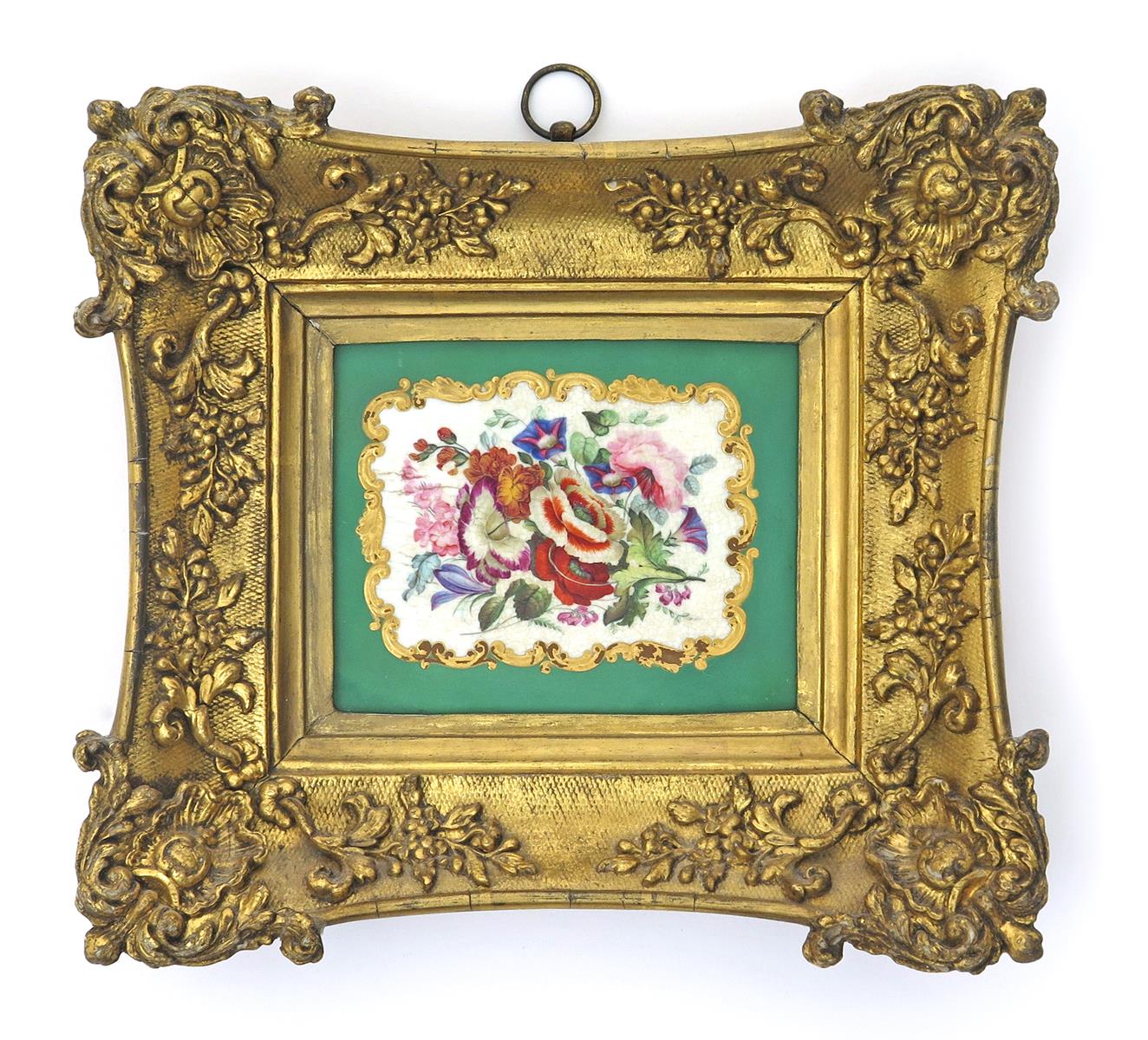 A small Derby rectangular plaque c.1830, painted with a floral arrangement including rose, convolvulus and poppy, reserved in a scrolling gilt cartouche on an apple green ground in the Sèvres style, crowned interlaced LL mark, in a gilt wood frame, some crazing, the plaque 10cm x 12cm.