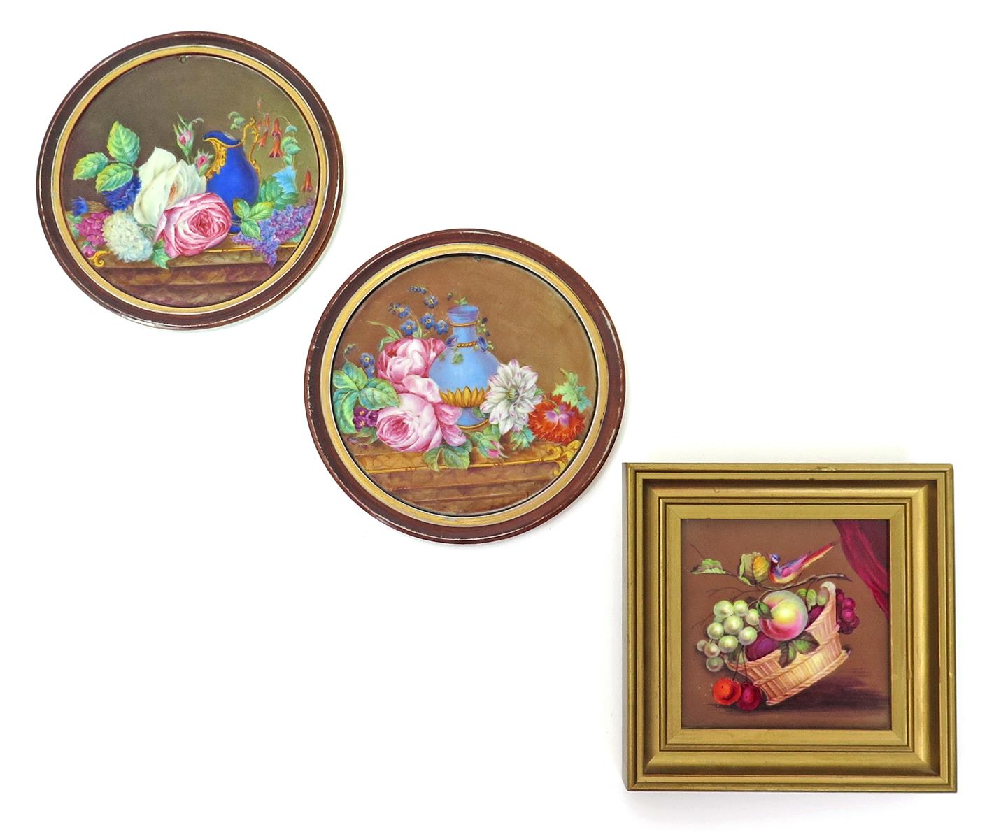 A pair of porcelain circular plaques 19th century, painted with ewers amidst large rose, lilac and dahlia flowers, resting on decorative table tops, and an English porcelain square plaque painted with a colourful bird alighted on a fruiting branch on a tilted basket filled with grapes and other fruits, in a later giltwood frame, 13.3cm max. (3)