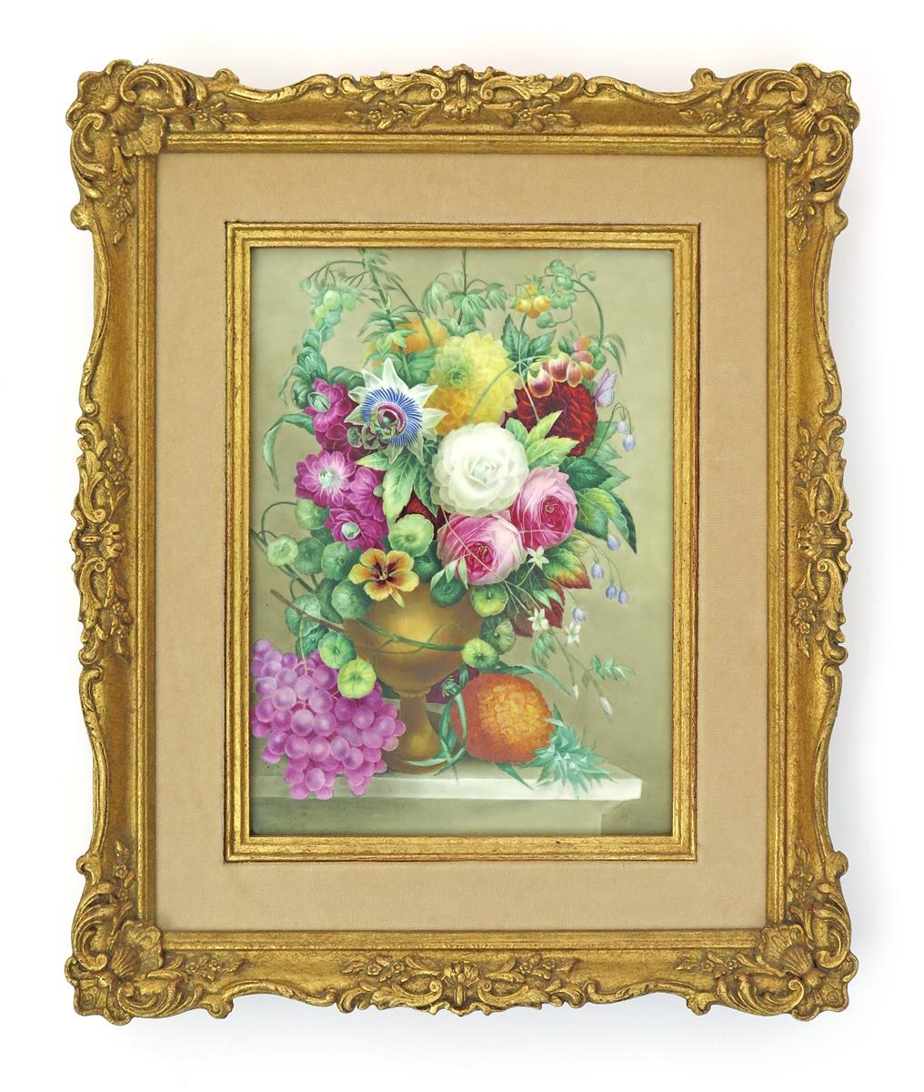 An English porcelain rectangular plaque 19th century, finely painted with a vase of flowers including nasturtium, chrysanthemum, hollyhock and passionflower, resting on a white stone ledge beside a large bunch of grapes and a pineapple, within a gilt wood and velvet frame, the plaque 26cm x 19cm.