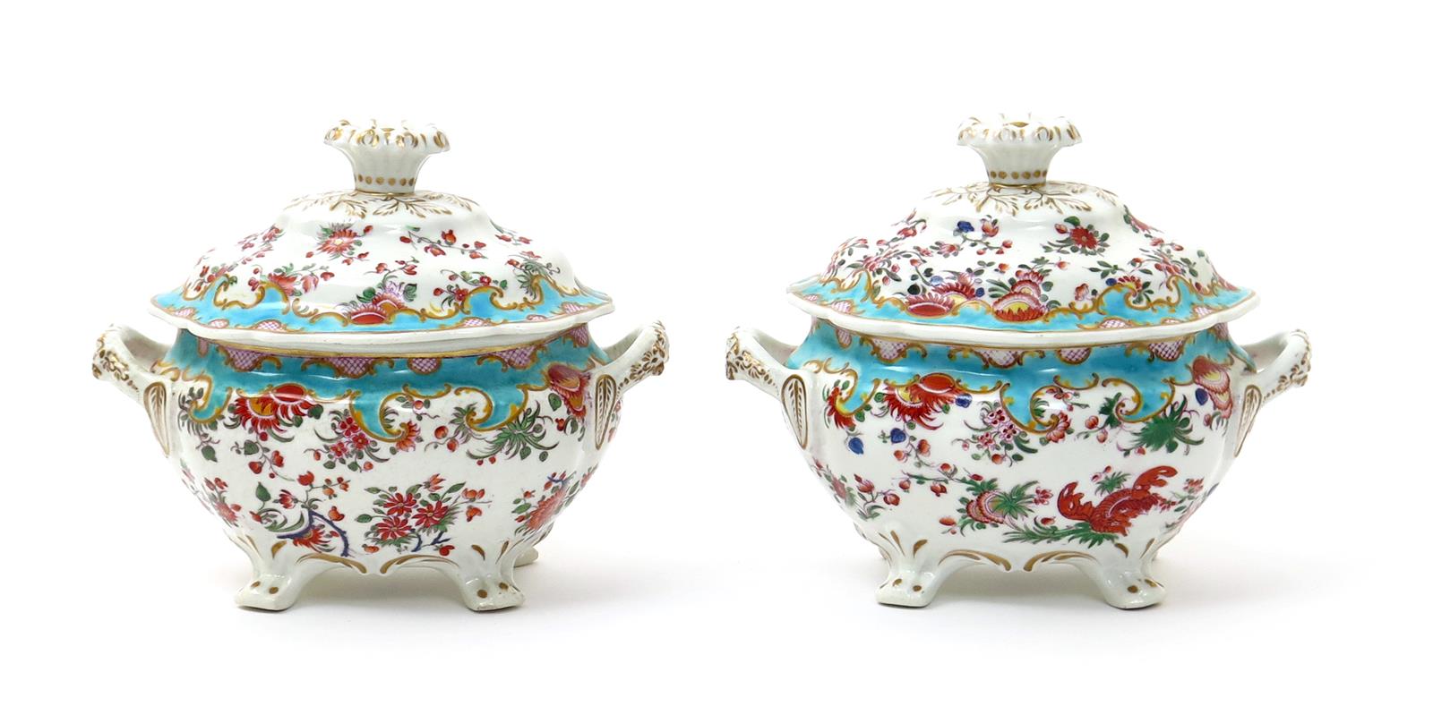 A pair of Chamberlain's Worcester sauce tureens and covers 1st half 19th century, decorated in pattern 1713 with flowers in the Kakiemon palette reserved within shaped turquoise borders, each tureen raised on four paw feet, printed marks inside the covers, 19.5cm. (4)