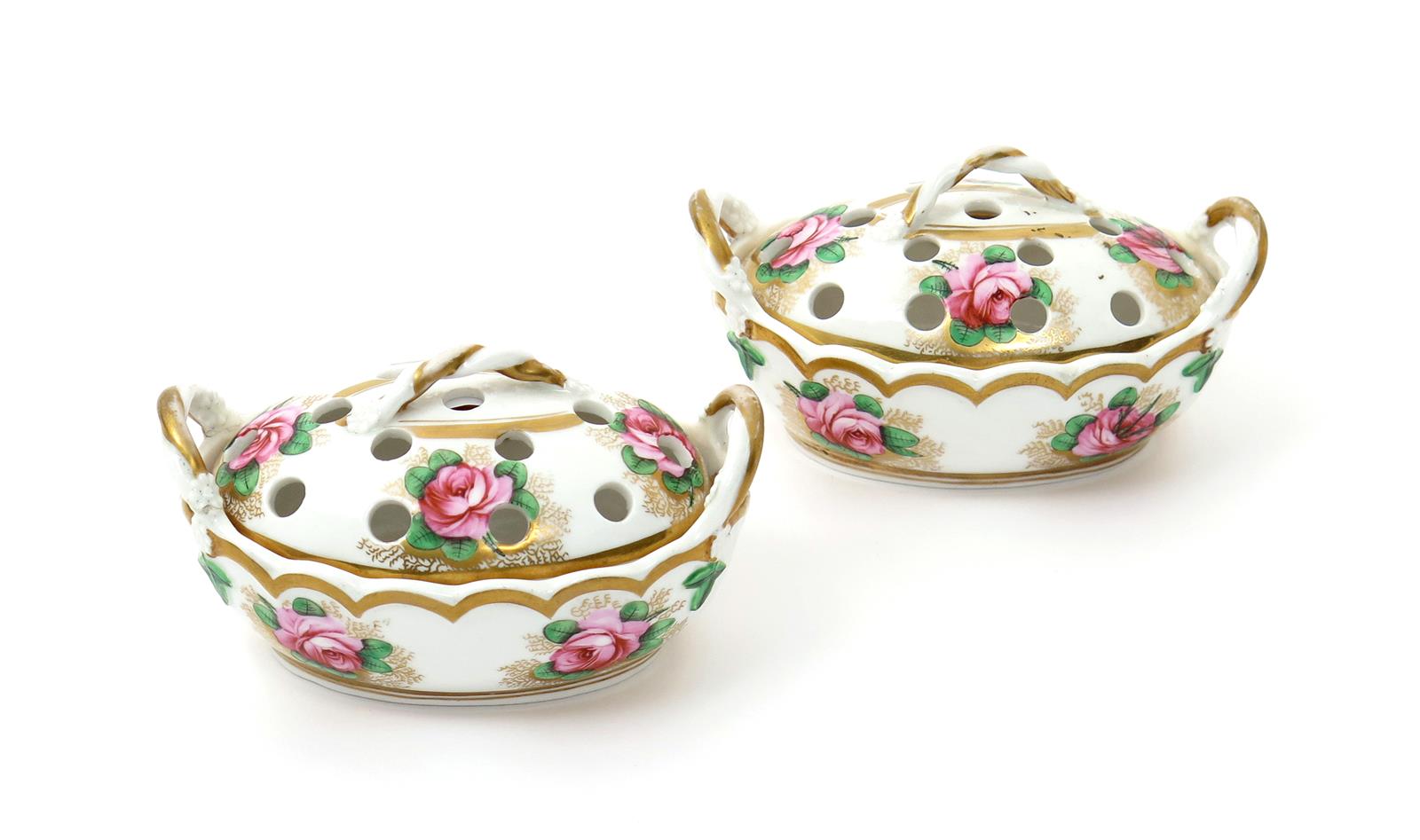 A pair of Spode violeteers and covers c.1810, the shallow oval forms painted in pattern 2812 with pink roses amidst gilt tendrils, the slightly domed covers pierced with an arrangement of small holes beneath the ropetwist handles, iron red marks and pattern numbers, a base crack to one, 10.5cm across. (4)