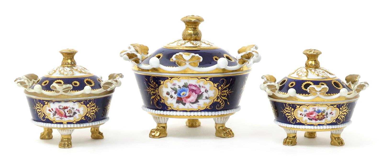 A garniture of three English porcelain pastille burners and covers c.1815-25, the drum shapes painted with panels of flowers reserved on a mazarin blue ground, each raised on three paw feet, the rims moulded with leaves and beads, the covers pierced with holes, some restoration, 13cm high max. (6)