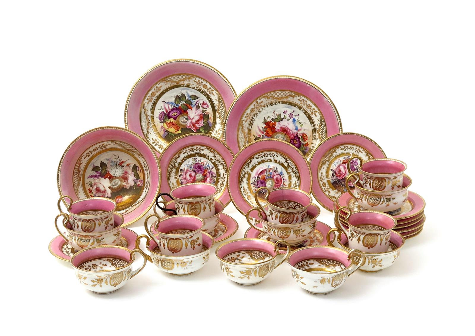 A Coalport part tea service c.1820-30, painted with birds' nests containing eggs, before colourful arrangements of flowers, within formal gilt borders reserved on a pink ground. Comprising: two plates, a slop bowl, nine teacups, six coffee cups and twelve saucers. (30)