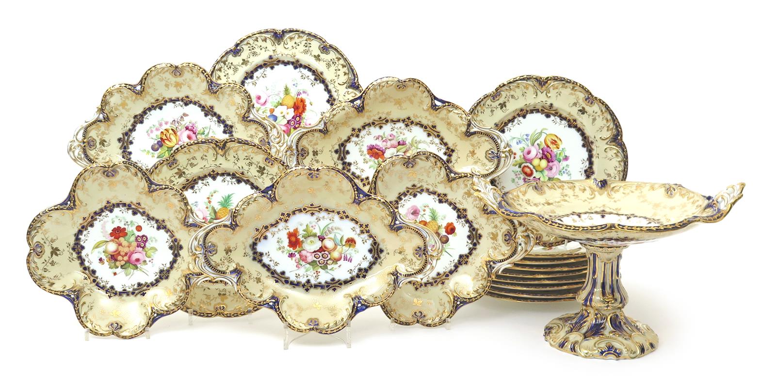 A Coalport part dessert service c.1840, the wells brightly painted with sprays of fruit and flowers, the lobed rims moulded with foliate scrolls and highlighted in gilt on a cafe au lait ground with a cobalt border, gilt 4/781 marks. Comprising: a high tazza, three pairs of shaped dishes, and eighteen plates. (25)