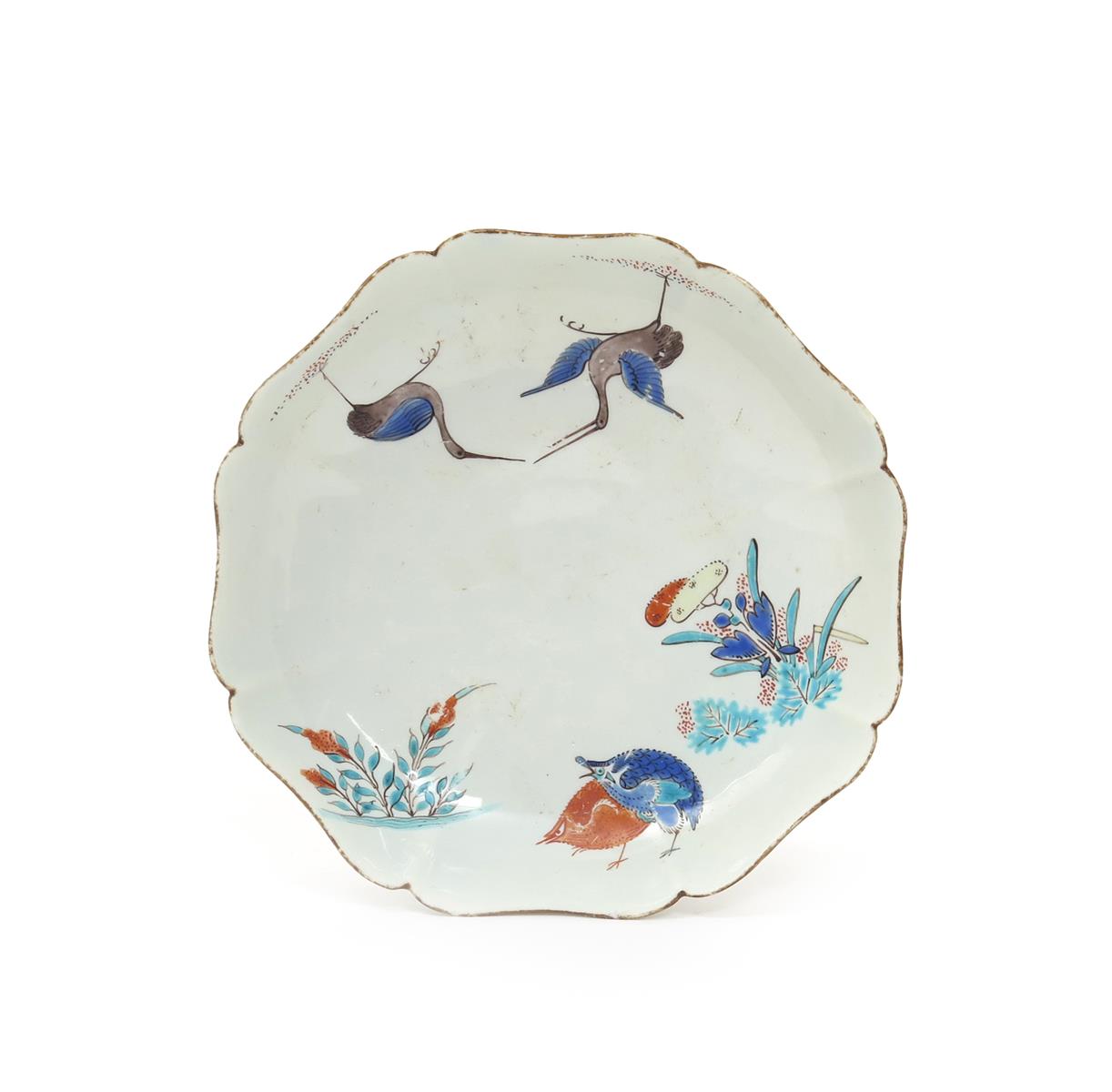 A Chantilly lobed saucer c.1730-35, painted in the Kakiemon palette with a version of the Two Quail pattern, the two birds between millet and flower sprays, and with two confronting cranes, red hunting horn mark, 12.5cm.