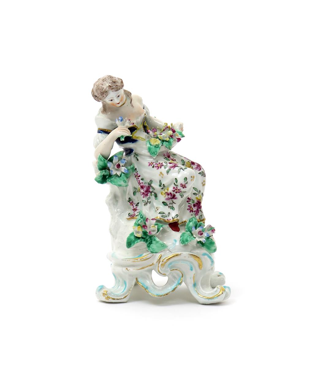 A Bow figure of Smell c.1760, from the Senses series, modelled as a young girl seated atop a four-footed base with an apron full of flowers, leaning on her right elbow and bending her head to sniff the blooms she holds, some small losses to the flowers and leaves, 17.5cm.
