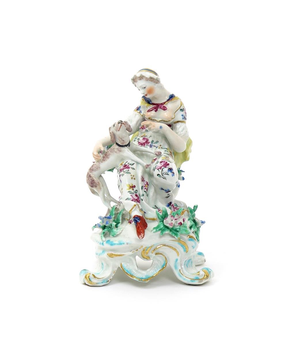 A Bow figure of Touch c.1760, from the Senses series, modelled as a lady seated on a low stump and reaching out to stroke her dog as it climbs onto her lap, raised on a scrolled four-footed base picked out in turquoise and gilt, a few small chips, 15.5cm.