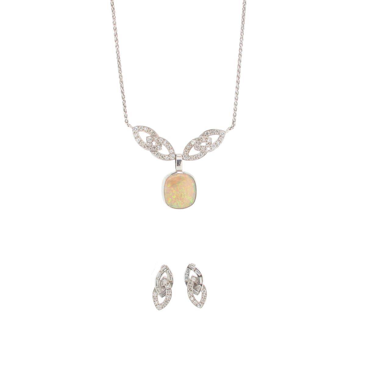 An opal and diamond pendant, the solid white opal is set on a white gold chain with interlocking lozenges set with circular-cut diamonds, with a matching pair of earrings, the interlocking lozenges alternately-set with baguette-shaped and circular-cut diamonds in white gold