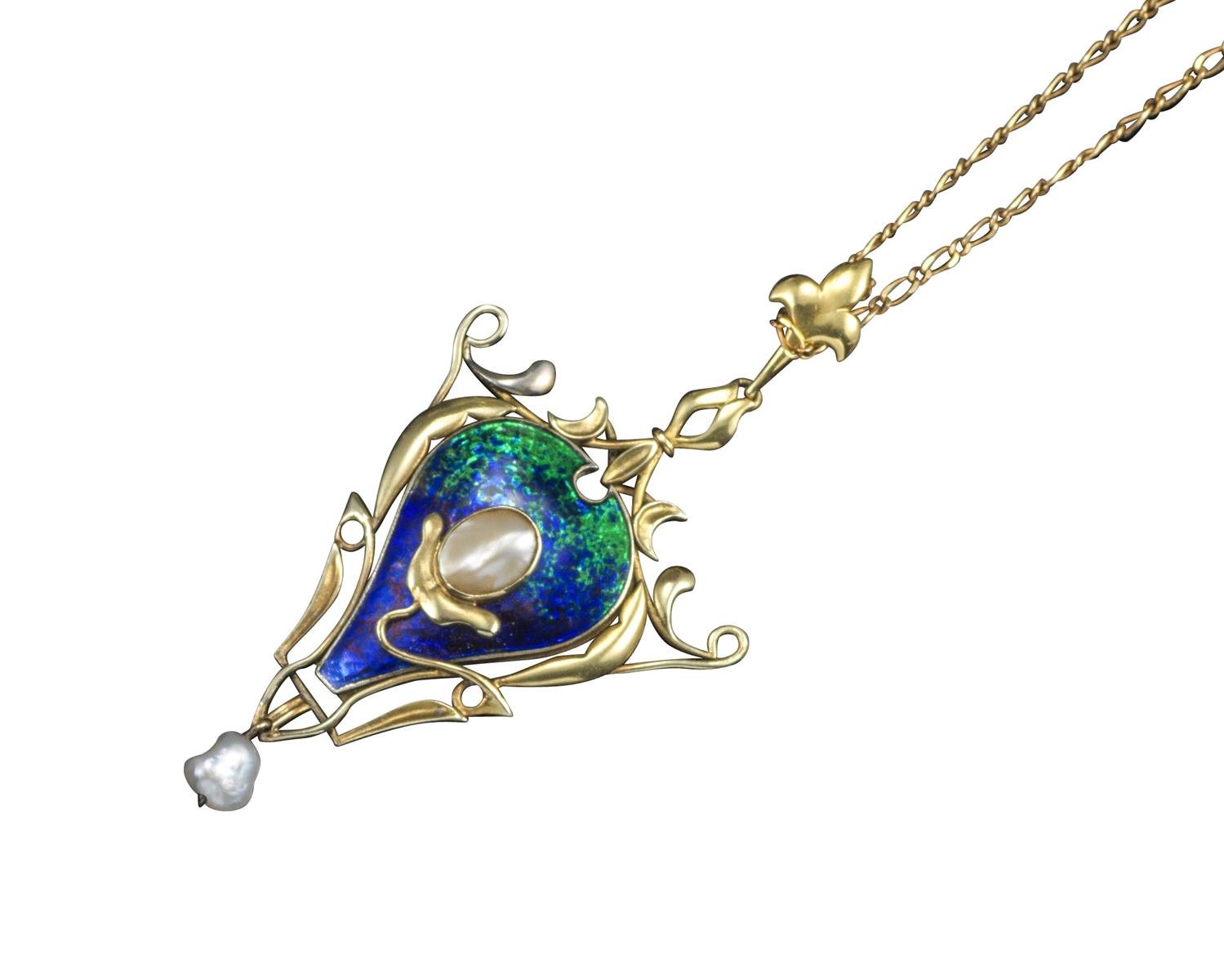 An Arts & Crafts gold, enamel and pearl pendant, centred with an oval-shaped pearl in foliate mount on a green and blue enamel ground suspending a baroque-shaped pearl with a stylised fleur-de-lys pendant loop, on a fine-link gold neck chain, 60cm