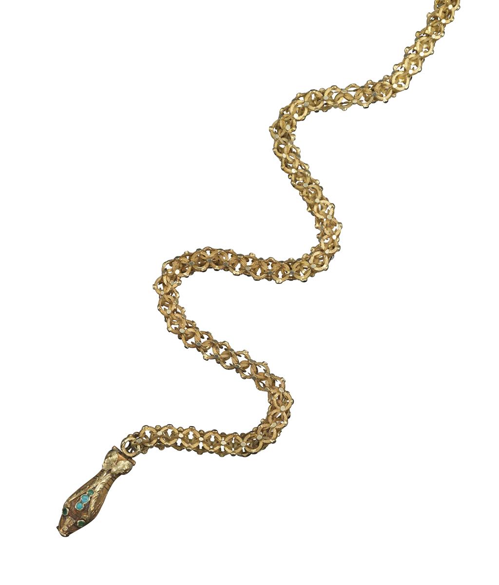 A late George III style two-colour gold longuard chain, the textured circular links multi-joined with small flat sections, the George III gold clasp designed as a serpent's head set with turquoise cabochons and emerald eyes, 120cm, 66g
