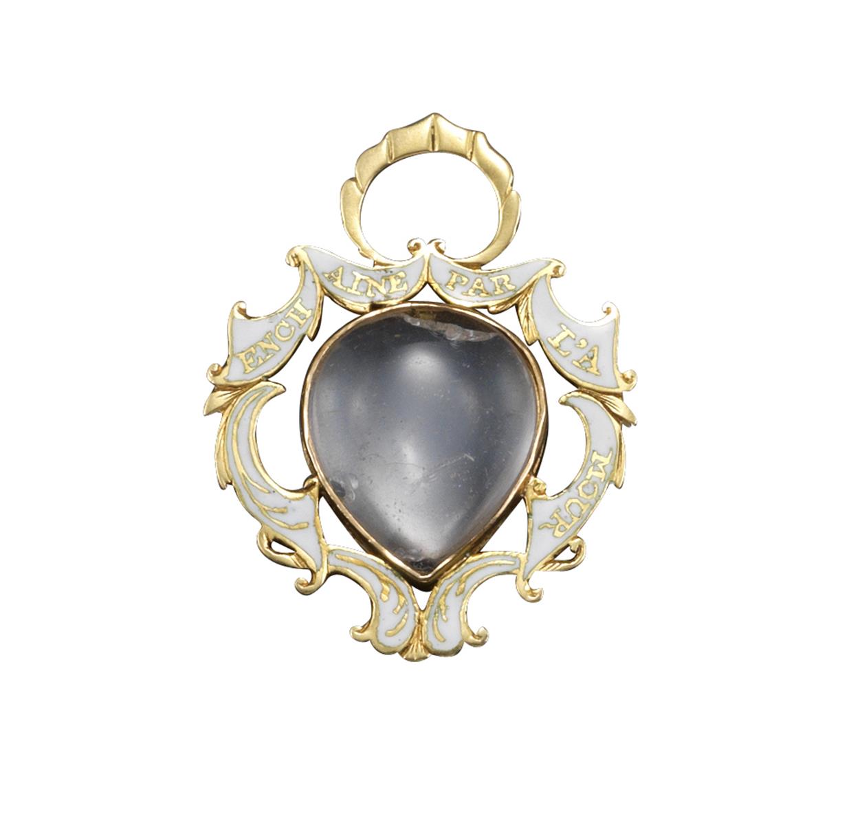 A George III sentimental enamel and gold locket, with the words 'Mon coeur est a vous' to one side on red enamel and 'enchaine par l'amour' to the other on white enamel which translates to mean 'my heart is chained to you by love', with a teardrop-shaped glazed locket compartment to the centre, in yellow gold, 3cm high