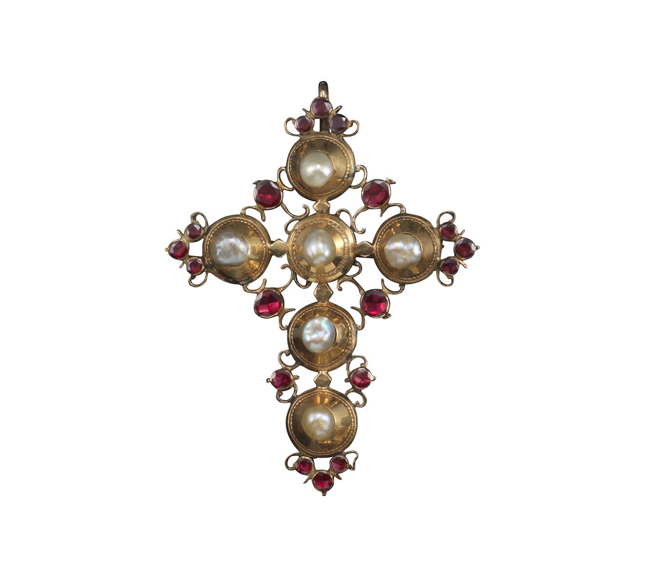 An 18th-century gold cruciform pendant brooch, each circular disc set with a pearl and further graduated circular-cut garnets, 7.5 cm high