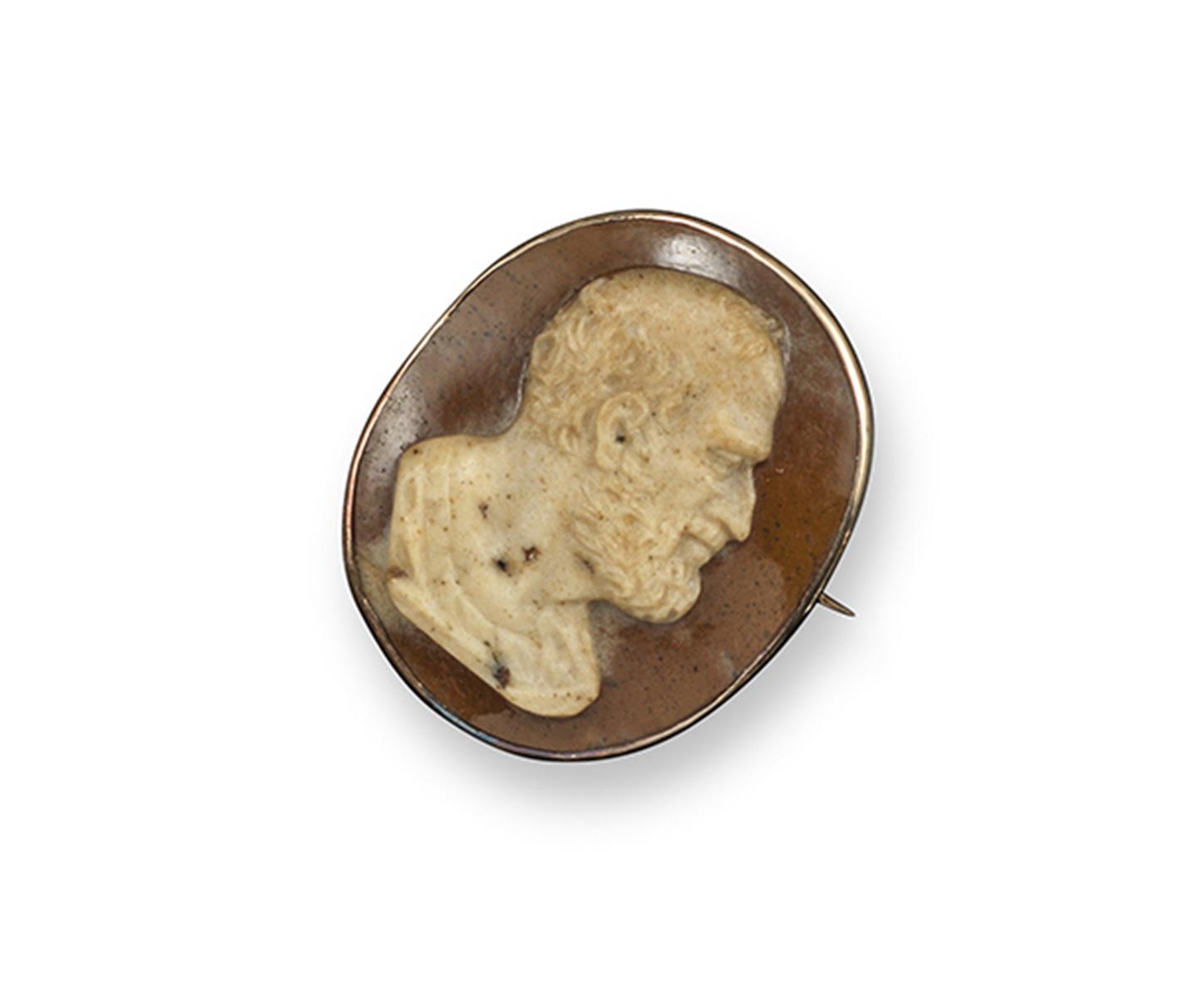 An 18th-century carved hardstone cameo brooch, depicting the profile of a bearded man with thinning hair, probably a Roman philosopher, mounted in a gold brooch, 3.2cm